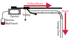 Trolley is attached to garage door using door arms.